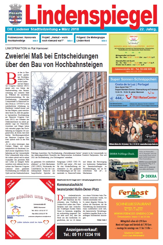 Bei den in Hannover geplanten Hochbahnsteigen in Hannover- Linden und am Hannover Congress Centrum (HCC) deutet sich von Seiten der Stadtverwaltung eine Bauentscheidung mit zweierlei Maß an. Während die umstrittene Standortentscheidung für den Hochbahnsteig Leinaustraße/ Limmerstraße in Hannover/Linden (Drcks.nr. 1297/2017), trotz mehrheitlicher Ablehnung im Bezirksrat Linden/Limmer und bei den Bürgern, quasi entschiedene Sache ist, steht der geplante barrierefreie Hochbahnsteig am Hannover Congress Centrum (HCC) aus Gründen des Denkmalschutzes an seiner geplanten Lage zur Disposition. Anwohner und Bürger haben sich vermehrt gegen den Hochbahnsteig an besagtem Ort ausgesprochen, da dieser, laut einer breiten Bevölkerungsmehrheit am Hannover Congress Centrum optisch nicht in das Bild passt.