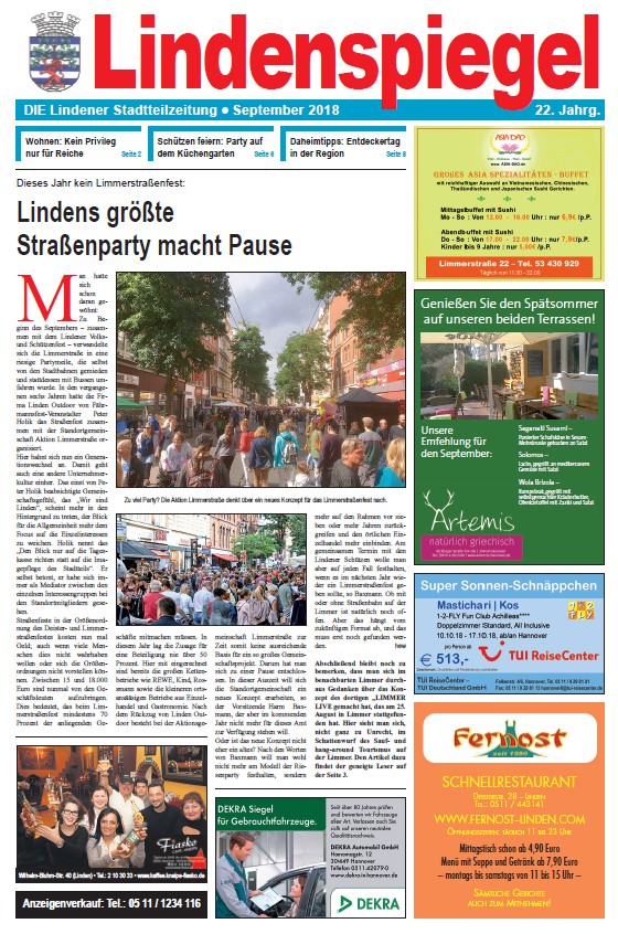 Man hatte sich schon daran gewöhnt: Zu Beginn des Septembers – zusammen mit dem Lindener Volksund Schützenfest – verwandelte sich die Limmerstraße in eine riesige Partymeile, die selbst von den Stadtbahnen gemieden und stattdessen mit Bussen umfahren wurde. In den vergangenen sechs Jahren hatte die Firma Linden Outdoor von Fährmannsfest-Veranstalter Peter Holik das Straßenfest zusammen mit der Standortgemeinschaft Aktion Limmerstraße organisiert.